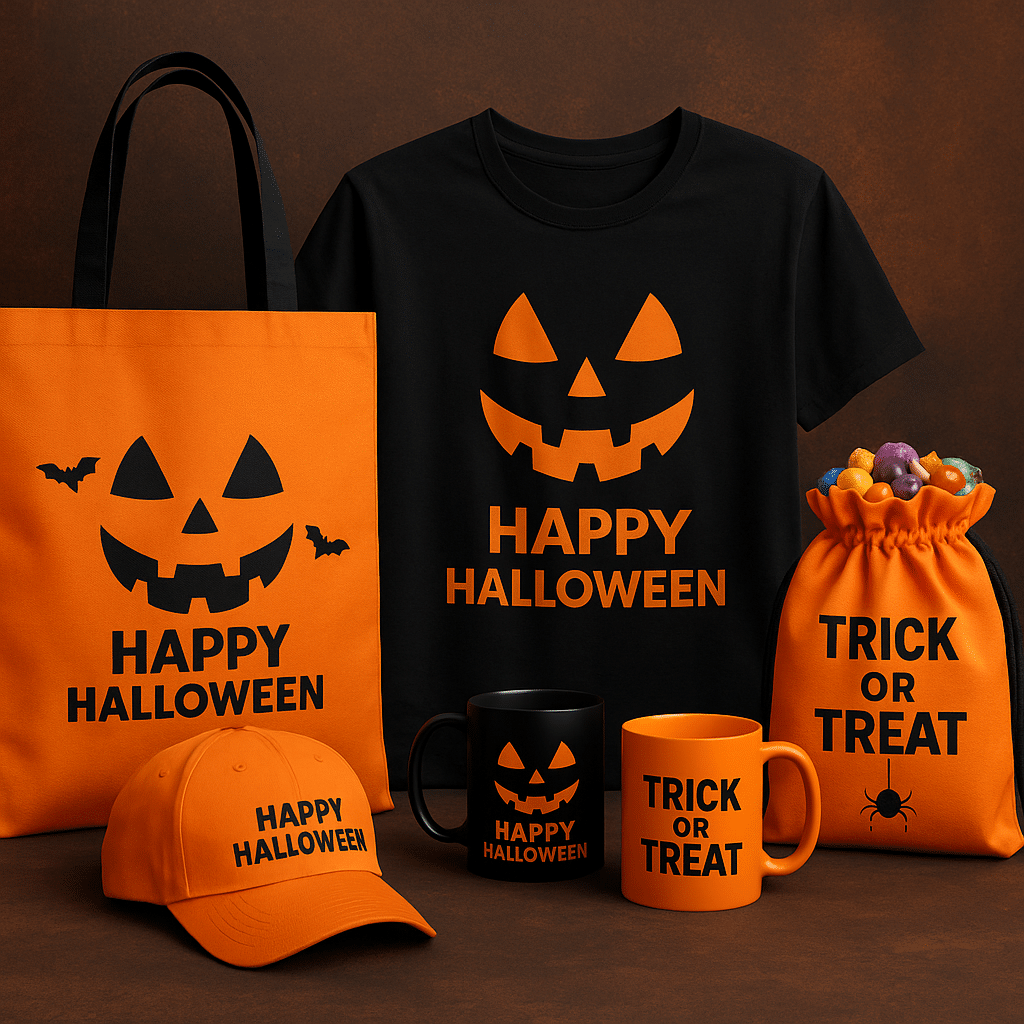 Cada item pode receber a logo da sua empresa e as cores do Halloween — preto, laranja, roxo ou grafite.